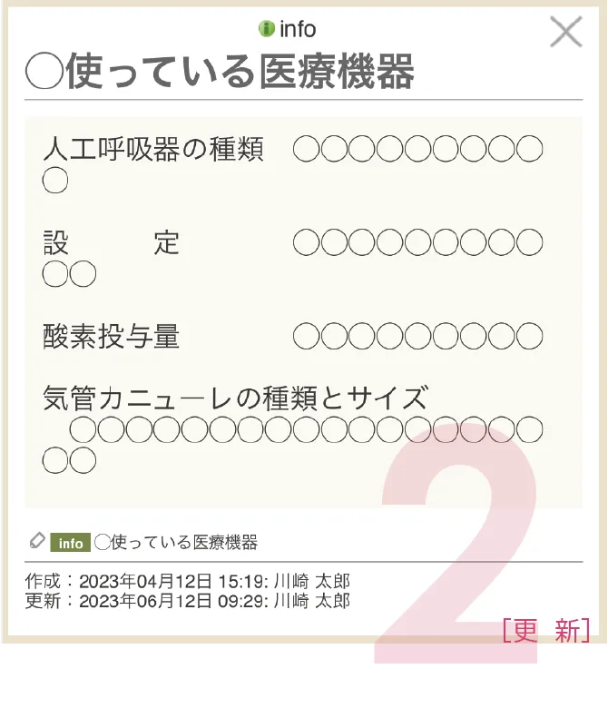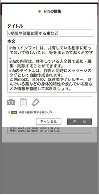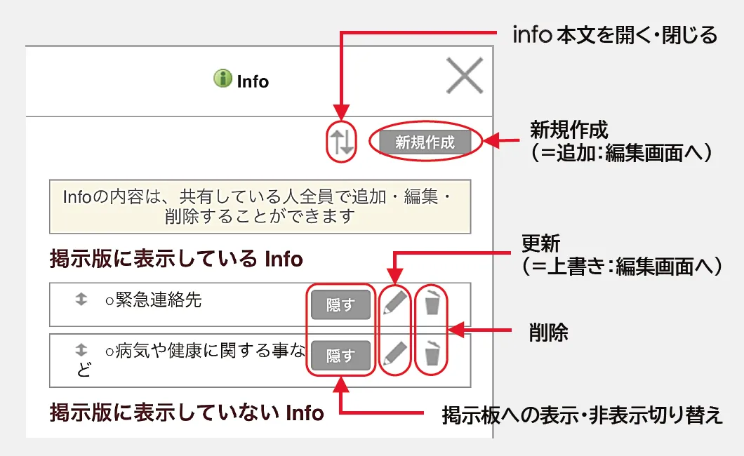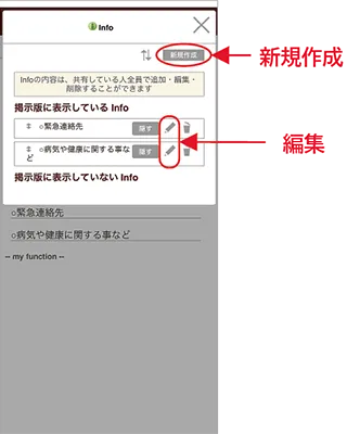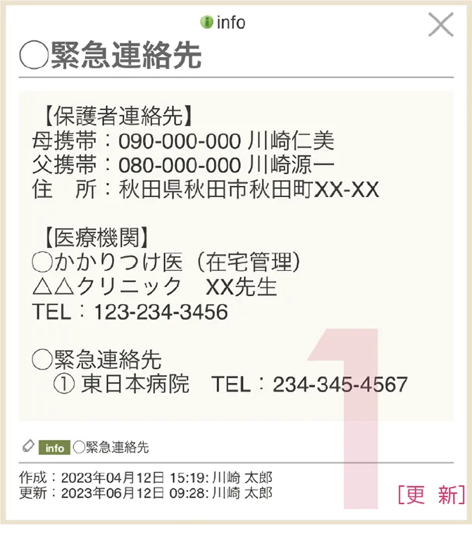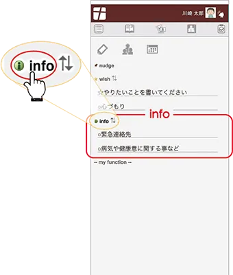 ※「緊急連絡先」「病気や健康に関する事など」の2項目のタイトルが「表示しているinfo」にデフォルトで設定されています。